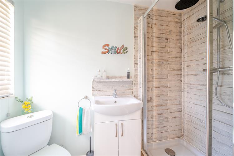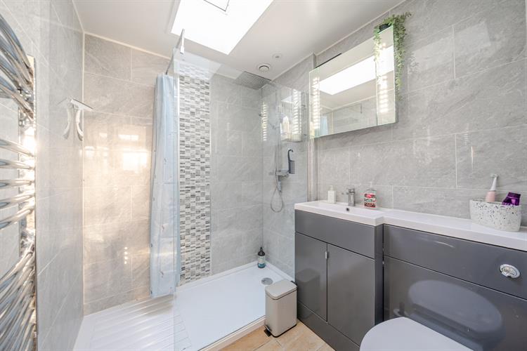The spacious master bedroom has a modern and newly fitted en-suite shower room with a large walk-in shower, vanity wash basin with cupboard, low level w.c. with enclosed cistern and a heated towel rail.